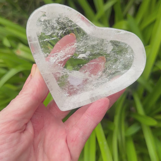 Genuine quality CLEAR QUARTZ HEART BOWL. Translucent and full of rainbows.